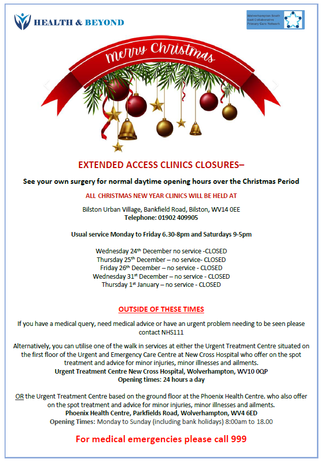 WSE PCN Christmas & New Year Opening Hours